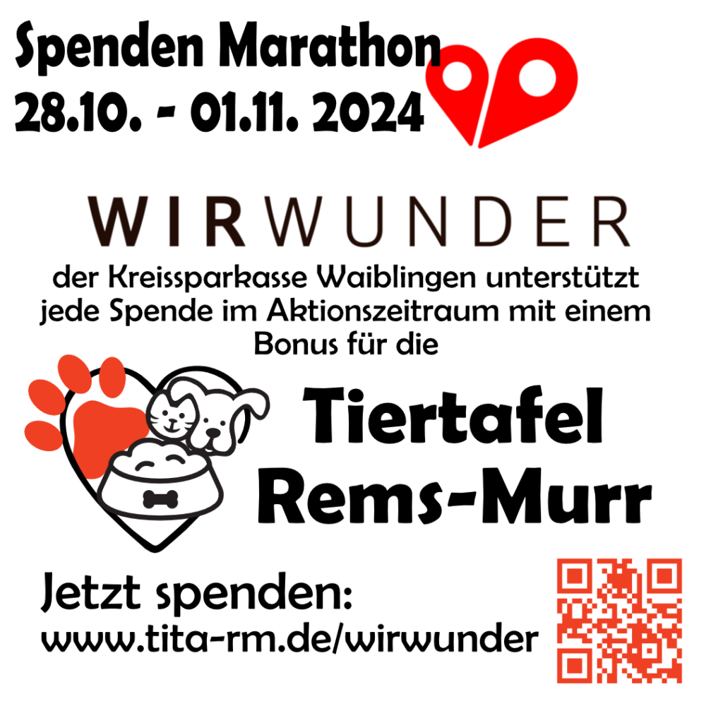 Es gibt wieder einen Spendenmarathon, bei dem die Kreissparkasse Waiblingen die Spenden aufstockt. Startschuss ist Montag, 28. Oktober 2024, 09:00 Uhr und der Spendenmarathon läuft bis zum Freitag, 01. November 2024, 23:59 Uhr